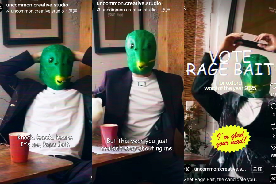 牛津词典联合创意工作室,为本次年度词汇“Rage bait(愤怒诱饵)”拍摄了拟人短视频。图为社媒视频截图。